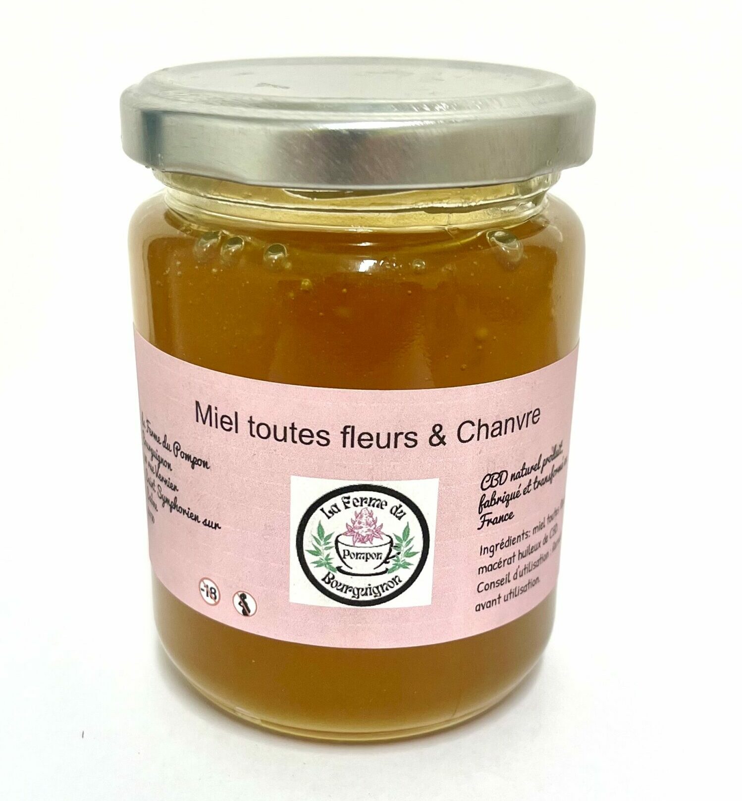 Mélange de miel toutes fleurs et de macérât de CBD – Transformé artisanalement à la ferme du Pompon Bourguignon, Saint-Symphorien-sur-Saône.
